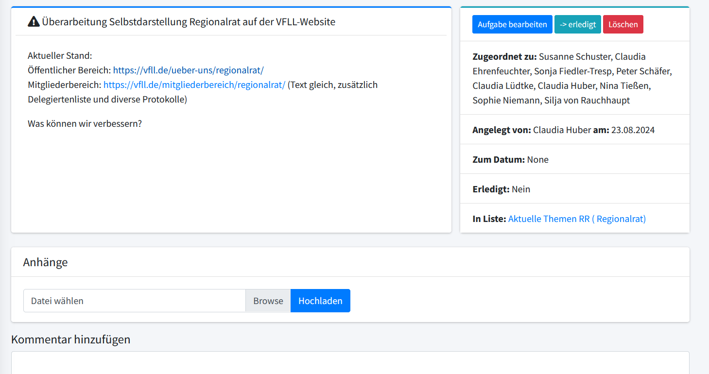 Hinweis: Nachträgliches Hinzufügen weiterer Anhänge führt nicht zu einer Benachrichtigung. Wenn die Mitglieder des Teams informiert werden sollen, bitte einen entsprechenden Kommentar schreiben.