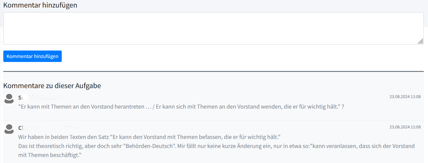 Die Kommentare werden mit dem Namen des/der Kommentierenden und dem Datum angezeigt.