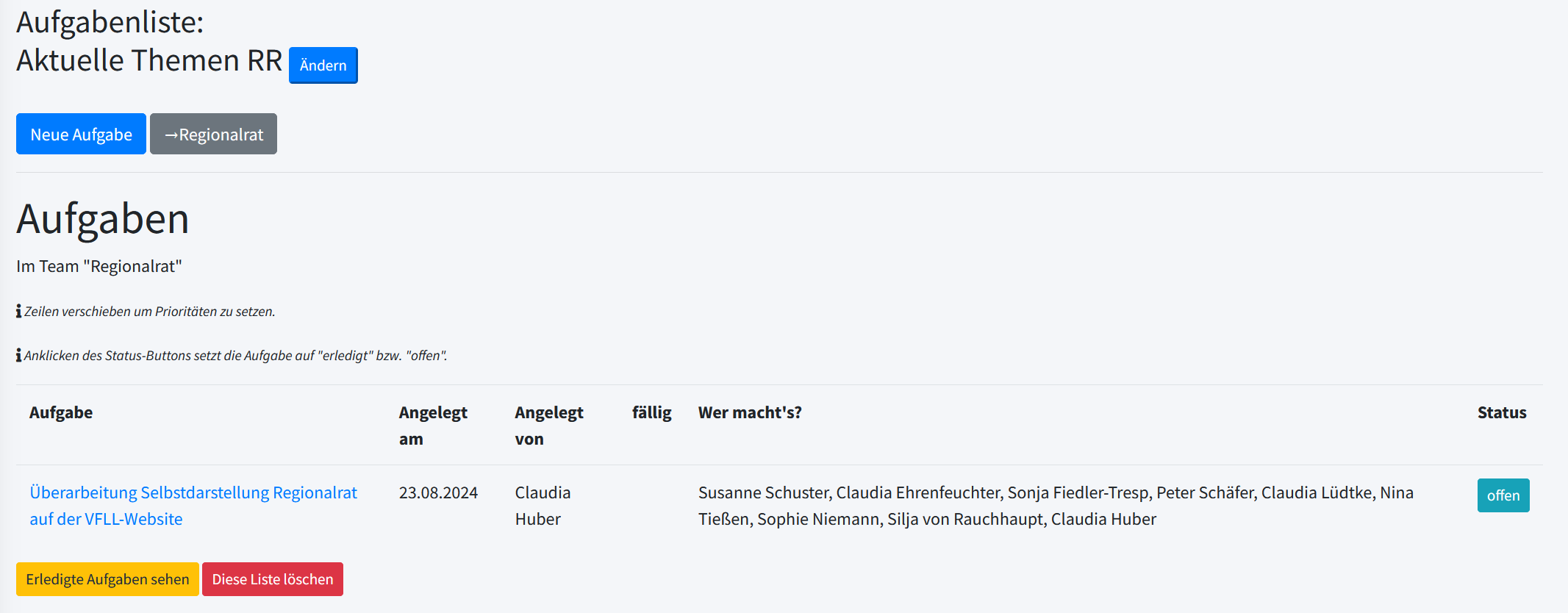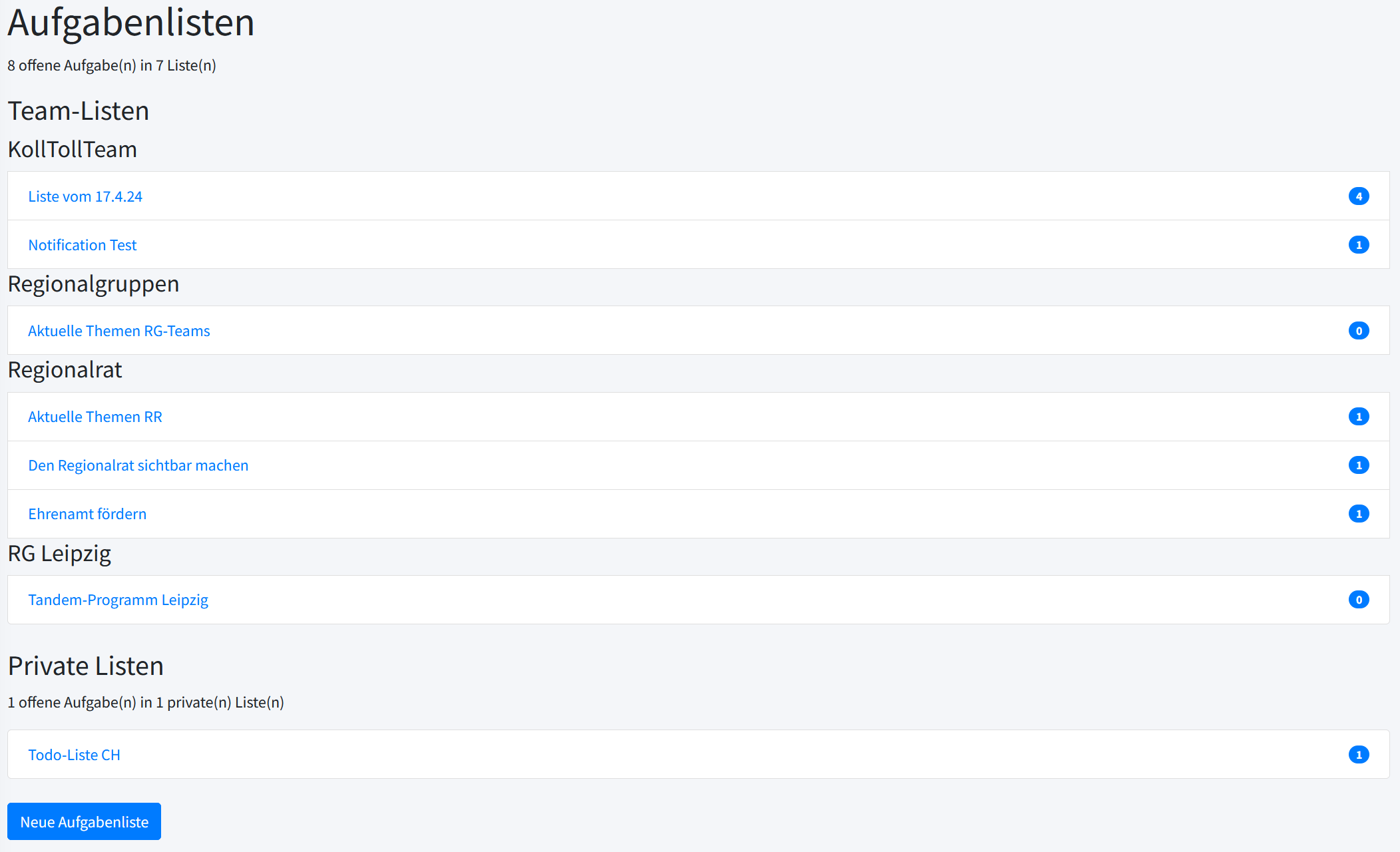 Aufgabenlisten sind Todo-Listen, in denen die Teams zu erledigende Aufgaben thematisch sortiert festhalten und deren Bearbeitung dokumentieren können.