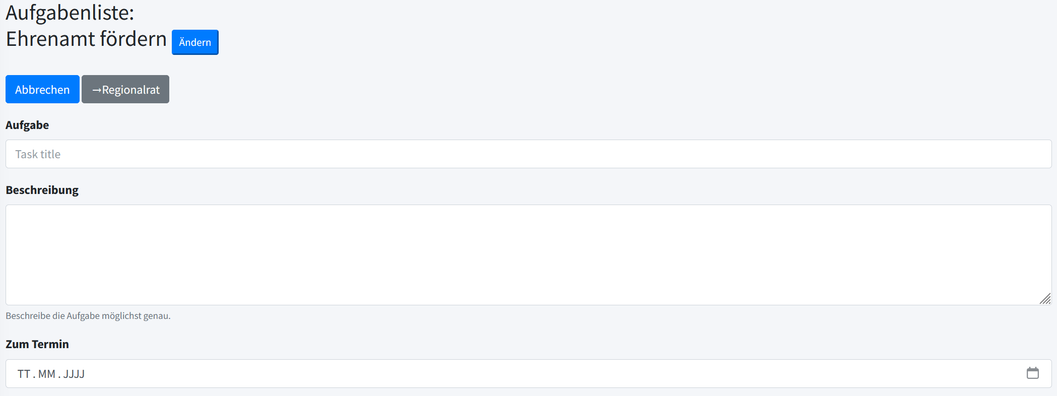 Oben steht der Name der Aufgabenliste, darunter ein Button zum Anlegen einer neuen Aufgabe. Der graue Button führt bei Bedarf zur Übersichtseite des Teams, dem die Aufgabenliste gehört. Über Ändern lässt sich die Aufgabenliste umbenennen.