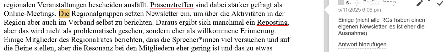 Man klickt die gelbe Markierung im Text an. Der Kommentar wird rechts neben dem Text angezeigt.