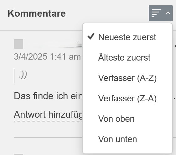 Dann werden am linken Rand die Kommentare fortlaufend angezeigt. Die Sortierung in der Kommentarspalte – standardmäßig steht der neueste oben - lässt sich über das Icon rechts oben in der Kommentarspalte beeinflussen.